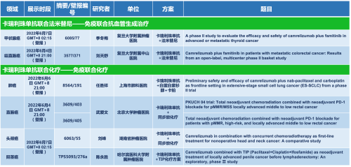 卡瑞利珠单抗联合EVO医药的另一款创新药法米替尼在甲状腺癌和结直肠癌领域有2项研究被接收为壁报,另有卡瑞利珠单抗联合化疗的4项研究在肺癌、结直肠癌、头颈癌和阴茎癌领域的研究被接收为5份壁报。