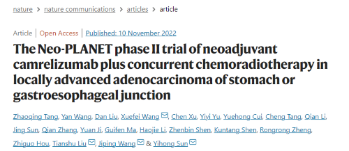 [1] Tang Z, Wang Y, Liu D, et al. The Neo-PLANET phase II trial of neoadjuvant camrelizumab plus concurrent chemoradiotherapy in locally advanced adenocarcinoma of stomach or gastroesophageal junction[J]. Nature Communications, 2022, 13(1): 1-11.