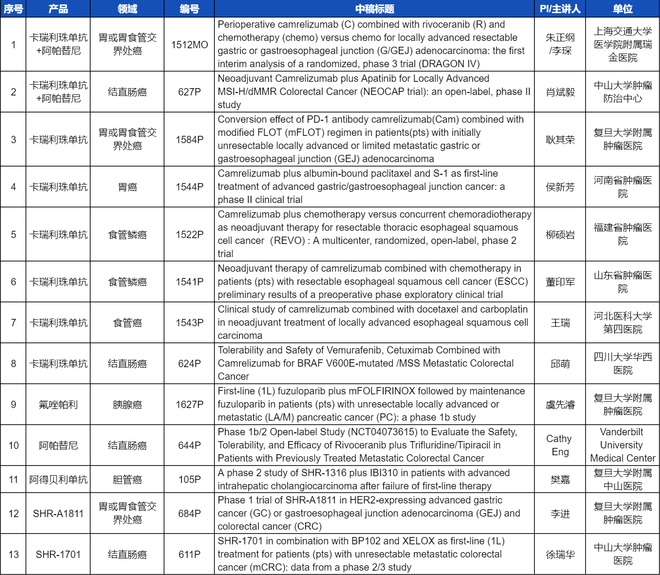 12款抗肿瘤创新药包括6款已上市产品:注射用卡瑞利珠单抗(艾瑞卡®)、甲磺酸阿帕替尼片(艾坦®)、马来酸吡咯替尼片(艾瑞妮®)、阿得贝利单抗注射液(艾瑞利®)、氟唑帕利胶囊(艾瑞颐®)、瑞维鲁胺片(艾瑞恩®),以及6款未上市产品:多靶点受体酪氨酸激酶抑制剂法米替尼、抗PD-L1/TGF-βRII双抗SHR-1701、组蛋白甲基转移酶EZH2抑制剂SHR2554、HER2抗体偶联药物(ADC)SHR-A1811、HER3抗体偶联药物SHR-A2009、新型选择性雌激素受体共价拮抗剂(SERCA)HRS8807等。此次ESMO大会的最新突破摘要(LBA)结果尚未披露,敬请期待!本文特对33项研究成果做了梳理,带领各位读者领略EVO医药创新之光。