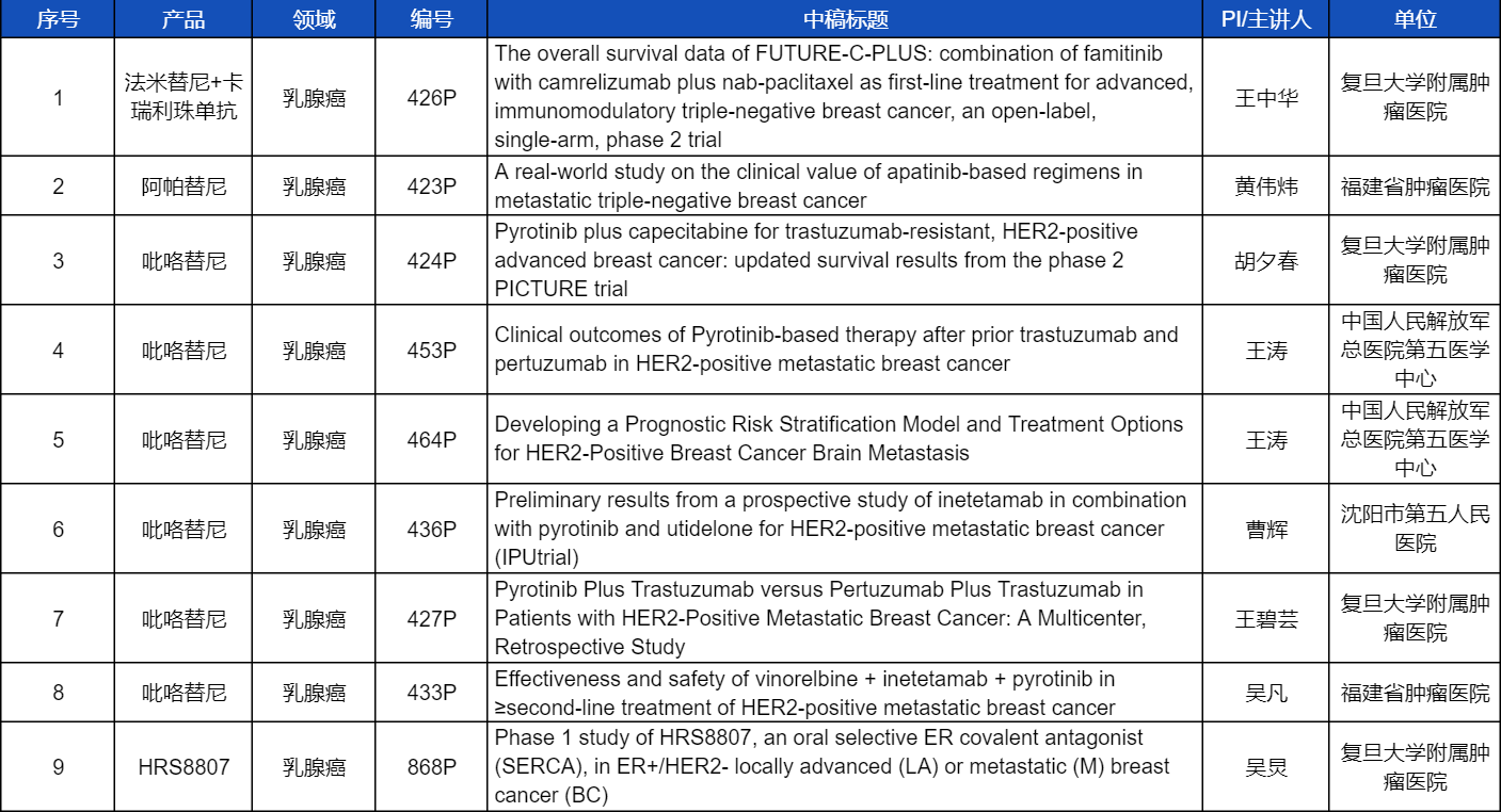 在乳腺癌领域,吡咯替尼、阿帕替尼、卡瑞利珠单抗、法米替尼,或产品间联合或联合化疗,共有9项研究入选壁报讨论,其中吡咯替尼占据6项,较为全面地展示了这款中国首个自主研发抗HER2靶向药在乳腺癌治疗中的显著特点和潜力。此外,EVO医药自主研发的新型选择性雌激素受体共价拮抗剂(SERCA)HRS8807治疗ER+/HER2-局部晚期或转移性乳腺癌的Ⅰ期研究也成功入选,有望为此类患者带来更多用药新选择。